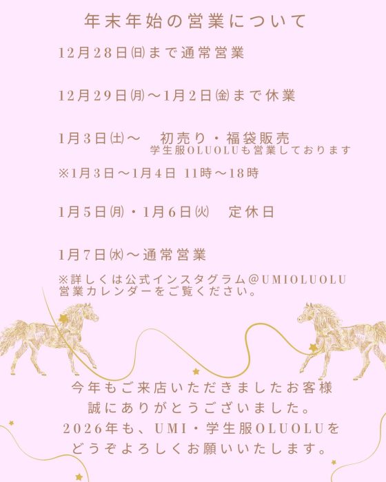 2026年も、セレクトショップUmi・学生服oluoluをどうぞよろしくお願いいたします。