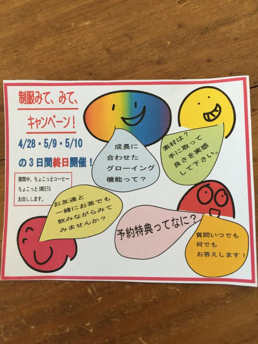 来年、中学に入学予定のお子様がいらっしゃる方、予約する前に一度制服を見ておきたい方、気軽に見に来てください♡