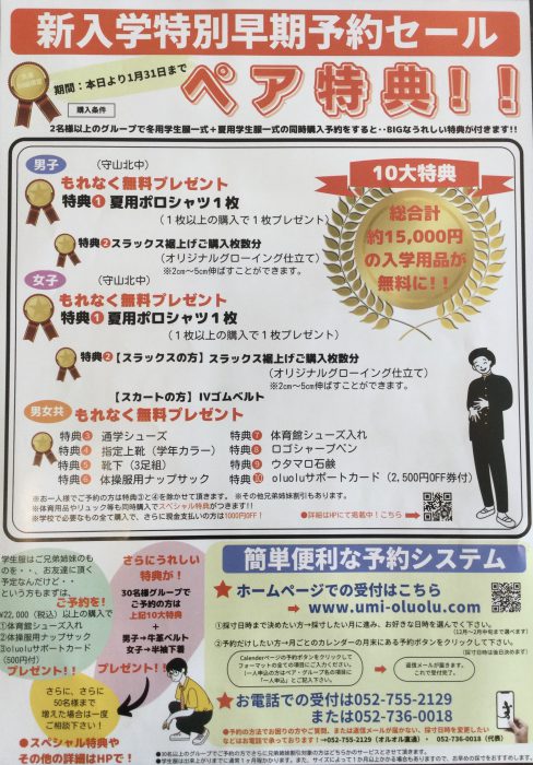 ◉兄弟・姉妹特典・・・以前当店で中学学生服をご購入頂いたお子様がいる方は、今回ご入学予定の男の子には牛革ベルト・女の子には下着を無料でプレゼント!