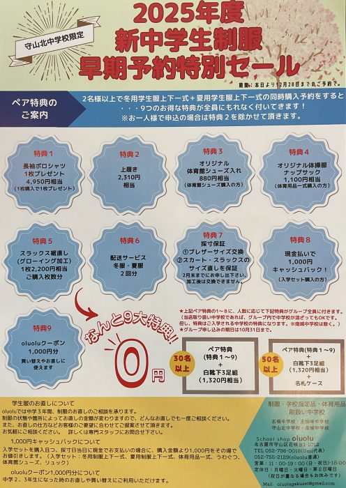 守山北中学校の早期予約購入特典↓↓↓