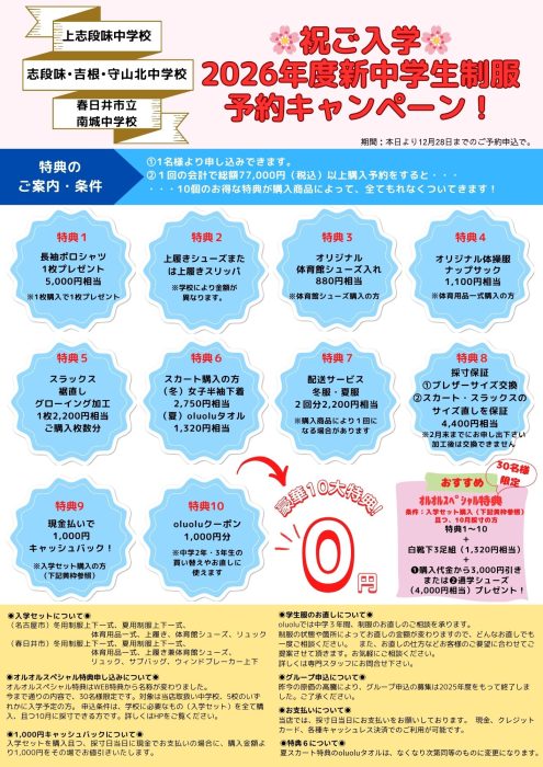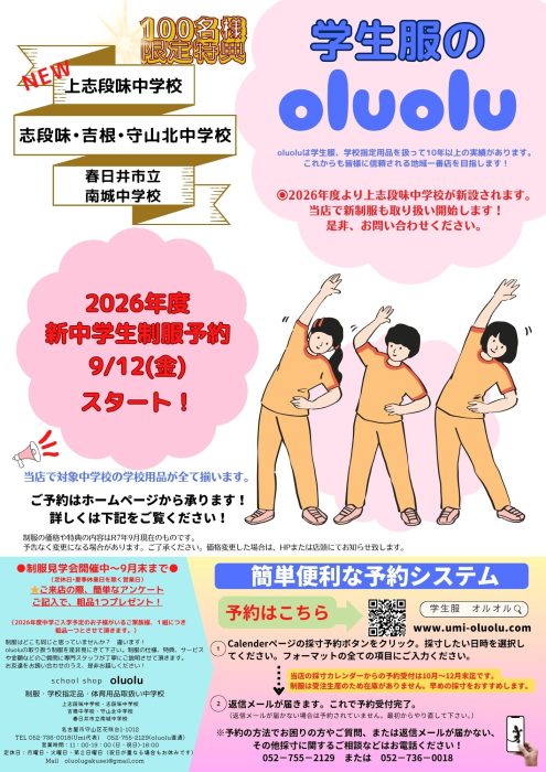いよいよ2026年度の新中学生制服の予約が始まります。